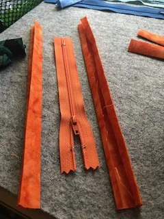 Make two strips about 4” longer than your zipper and about 2” wide. Fold long edges to center and press. Press again to center, with fold lines even.
