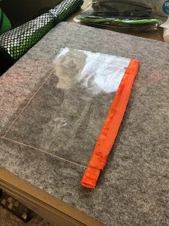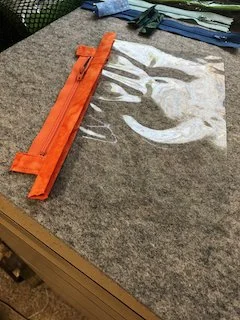 Place one long edge of vinyl into the fold crease of the edge fabric, and sew it to one side of the zipper using a zipper foot and use 2 lines of top stitching. You will be stitching through the top binding fabric with the vinyl inside the crease, and the zipper at the bottom.