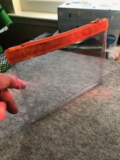I am using Batik fabric, 7” zipper, 12 gauge clear vinyl, size 14 needle and Metler Silk Finish cotton thread.